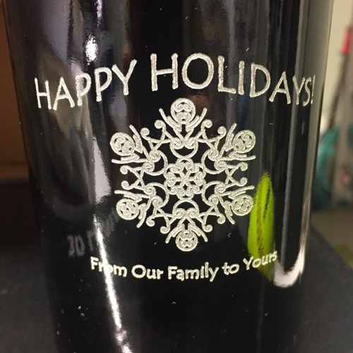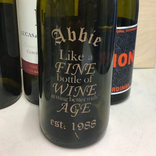 Just like our wine, our personalization techniques are high end. We use a process called sand carving to permanently engrave each bottle. These are all hand done by skilled artisans. This technique allows us to engrave an image or text on the bottle without harming the contents.